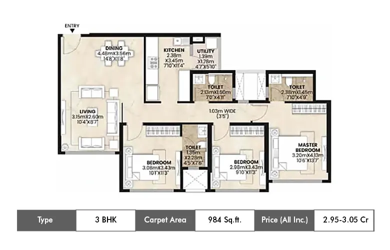 | 3 BHK | 984 Sq.ft. (Carpet Area) | 2.95 Cr - 3.05 Cr All Inc |